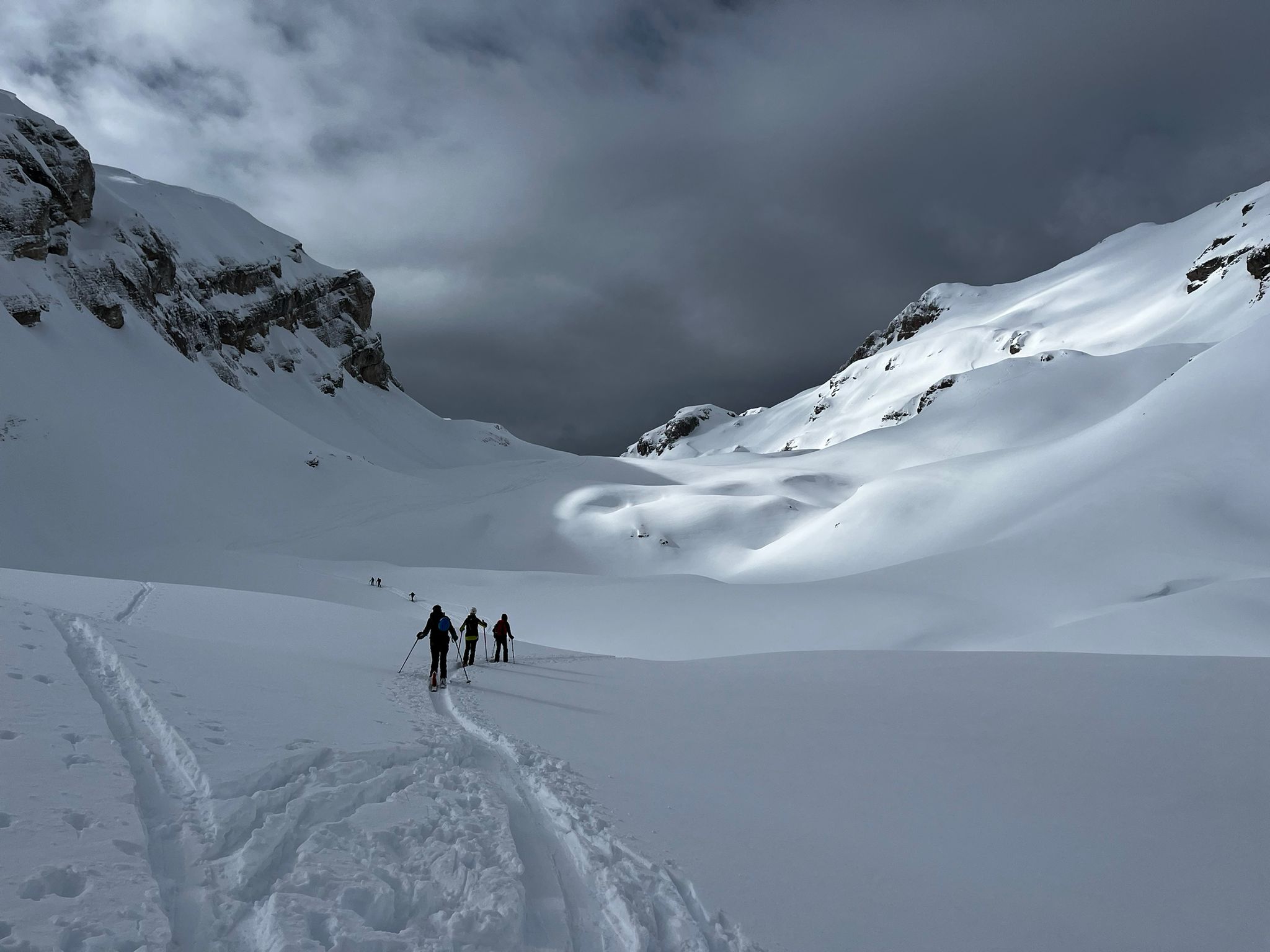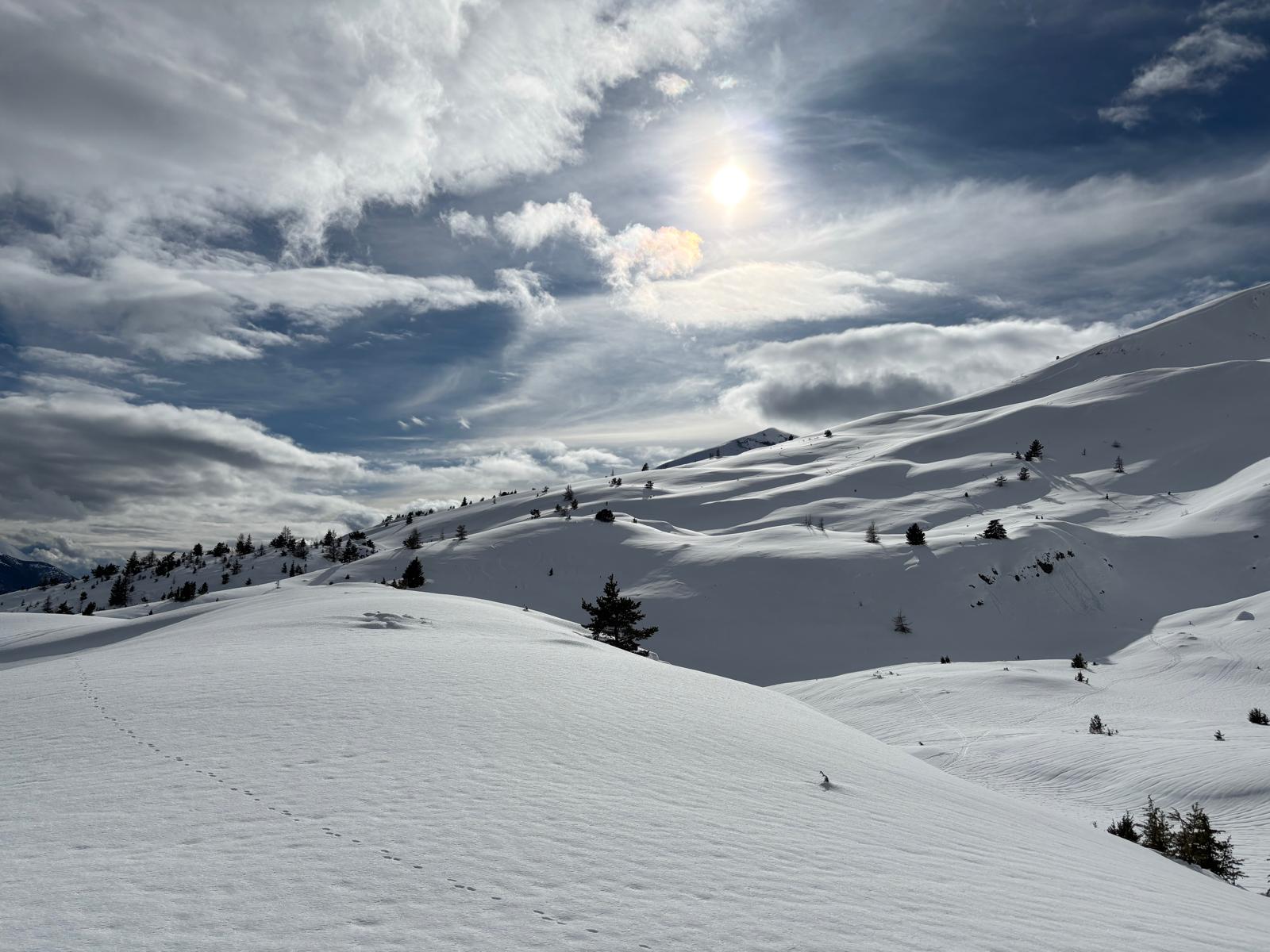 Bonne surprise, le ciel se découvre et la lumière revient. C’est nettement plus agréable pour descendre. Et heureusement parce que la neige est LOURDE et profonde ! Ça fatigue ! Plus bas, cela s’améliore lentement mais à notre grande surprise, le vallon est strié de nombreuses coulées que l’on traverse rapidement. Au débouché on trouve la neige moquette mais très vite aussi, la forêt dense. La descente cool se transforme en border cross puis carrément en mode sanglier très compliqué jusqu’à obliger certain.e.s à déchausser. On finit par retrouver un peu de lumière et d’espace de neige moquette pour rejoindre les voitures. Grosse balade de 1000 m de dénivelé pour un 1er jour, mais comme cela pourrait être le seul avec une météo correcte, on est bien contents de l’avoir faite.