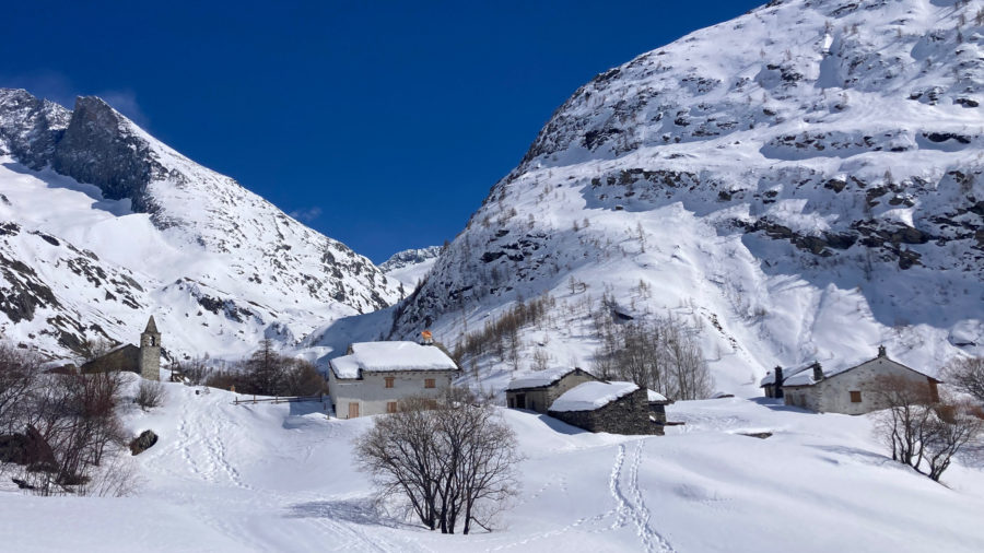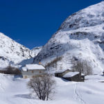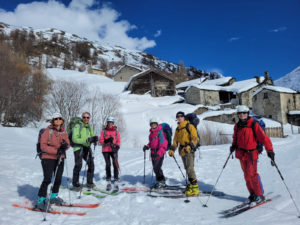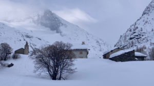 Un peu chargés (crampons, piolet, pique-niques, …), nous remontons à ski le torrent d’Avérole en traversant les jolis hameaux des Vincendières et d’Avérole.