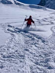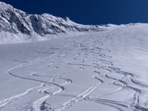 Le temps étant agréable, nous pique-niquons au sommet avant de nous engager dans la descente sur le glacier d’Arnès dans trente centimètres de poudreuse légère et magique. Nous suivrons notre itinéraire de montée et rejoindrons le refuge dans une encore très bonne neige.