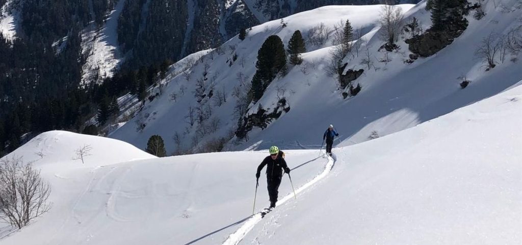 Le deuxième groupe est monté jusqu’à un ressaut à 2300 m, a bien profité du paysage et du picnic avant de redescendre. Comme la veille, le soleil voilé par le Scirocco a permis à la neige de décailler un peu mais pas trop, donc toute la descente s’est faite dans des conditions parfaites (sauf bien sûr quand il a fallu repasser les avalanches en bas du vallon).