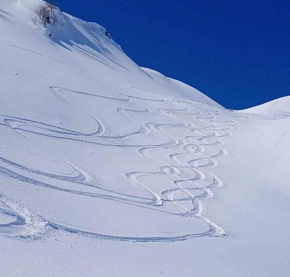 La descente est comme promise un délice, nous sommes le seul groupe dans la Combe de la Vache et il y a de la neige fraîche pour tout le monde.