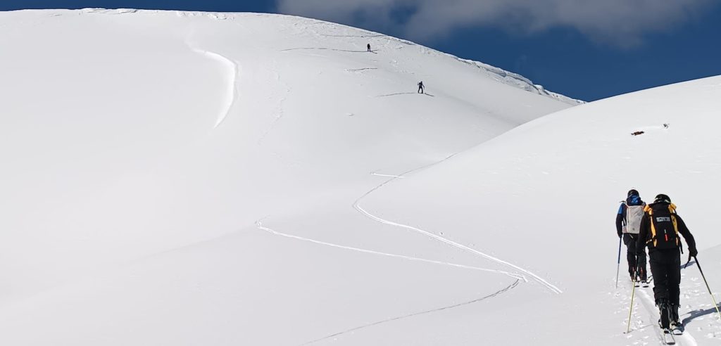 La météo du J3 s’annonce bonne, donc il faut saisir l’occasion pour monter au Thabor. Nous partons à 8h15 car il y a de la distance. La montée se fait tranquillement en voyant les différentes vallons, traces ou groupes partir un coup à droite, un coup à gauche. On peut facilement se tromper dans cet espace si vaste, surtout que la trace vers le Thabor a été effacée par le vent et la neige de la veille. Heureusement il y a le gps pour nous aider, et cela nous donne l’occasion de faire notre propre trace dans un décor somptueux: