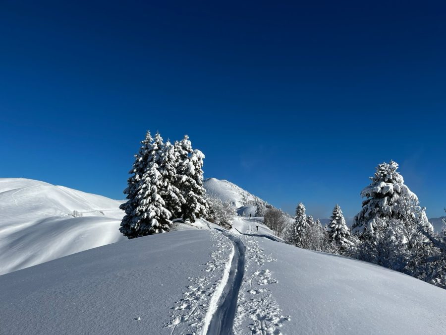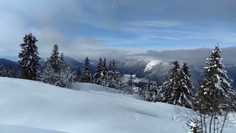 Nous choisissons donc une valeur sure pour profiter de la neige tombée dans la semaine : ce sera la Scia par la Combe de l’ours. A la descente nous re-peautons au Creux de la neige pour aller chercher le départ de l’ancienne piste. Puis après concertation nous décidons de pousser jusqu’au Bec de la Scia. Il faudra déchausser pour passer les quelques mètres un peu raides entre les rochers et arriver sans encombre au sommet.