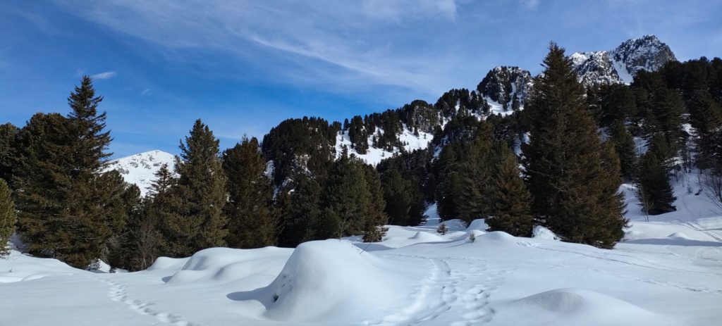 Départ à 8h29 (!) du parking de la chapelle Don Bosco. Parking de Casserousse pas trop bondé. Montée en bord de piste (piste de l’ancien téléski, balisée rando). Au premier coude à gauche, nous avons respectueusement suivi le passage balisé en forêt qui peut être… délicat/merdique. Cette fois-ci, c’était juste pas terrible. Une fois sur le chemin vers le Lac des Pourettes c’était vraiment très agréable… presque sans soleil, toutefois. Arrivés à la Brèche Nord des Lacs Robert, qqs rafales de vent modérées. A partir de là, vu l’expo sud la neige était moins agréable et plus inquiétante pour la descente à venir.