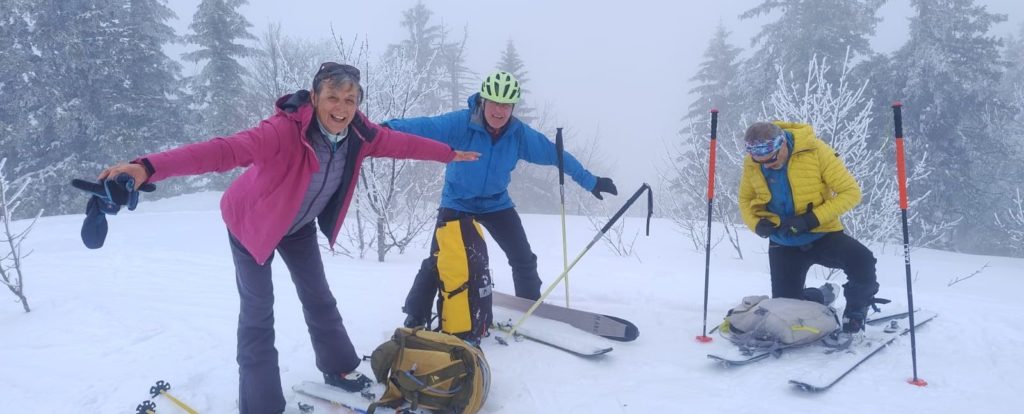 Nous sommes les premiers… ou presque. Le soleil se fait remarquer par sa grande discrétion, mais qu’importe ! Montée sur les pistes de la station (fermée) puis à droite dans la forêt pour rejoindre le bas du téléski du Creux de la neige. Au sommet de celui-ci, nous poursuivons jusqu’à la croix dans une tempête extrême.